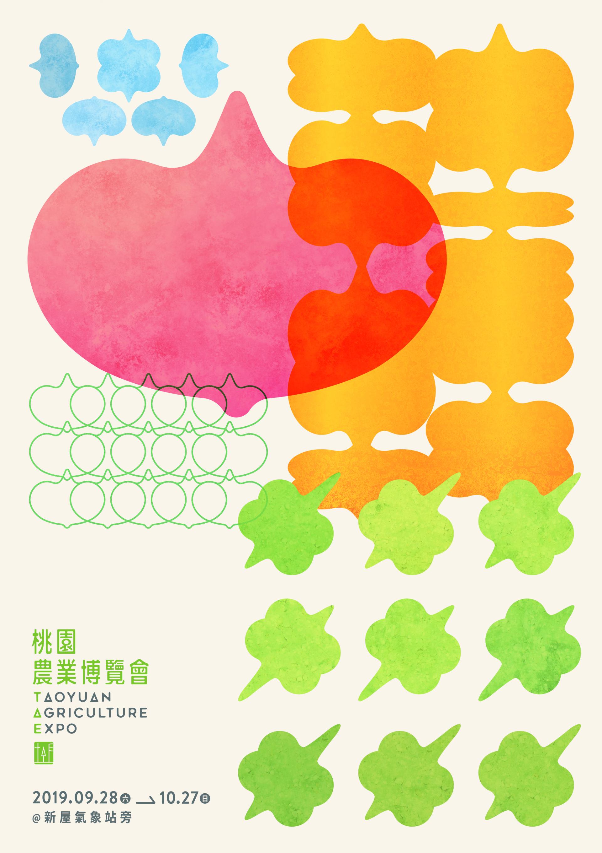 2019 桃園農業博覽會由方序中設計主視覺,以「種子萌芽」的形象作為農業的轉喻,並延伸出五款色彩清爽、造型童趣的種子圖形,呈現出生機盎然的風格。不僅貫串活動中的各種視覺素材,也分別對應五個主題展區。方序中將五款圖形以自由任意的手法排列,構成具有機感的整體主視覺。